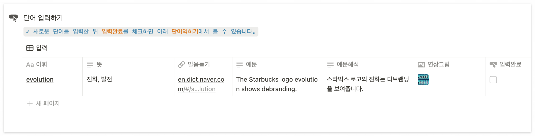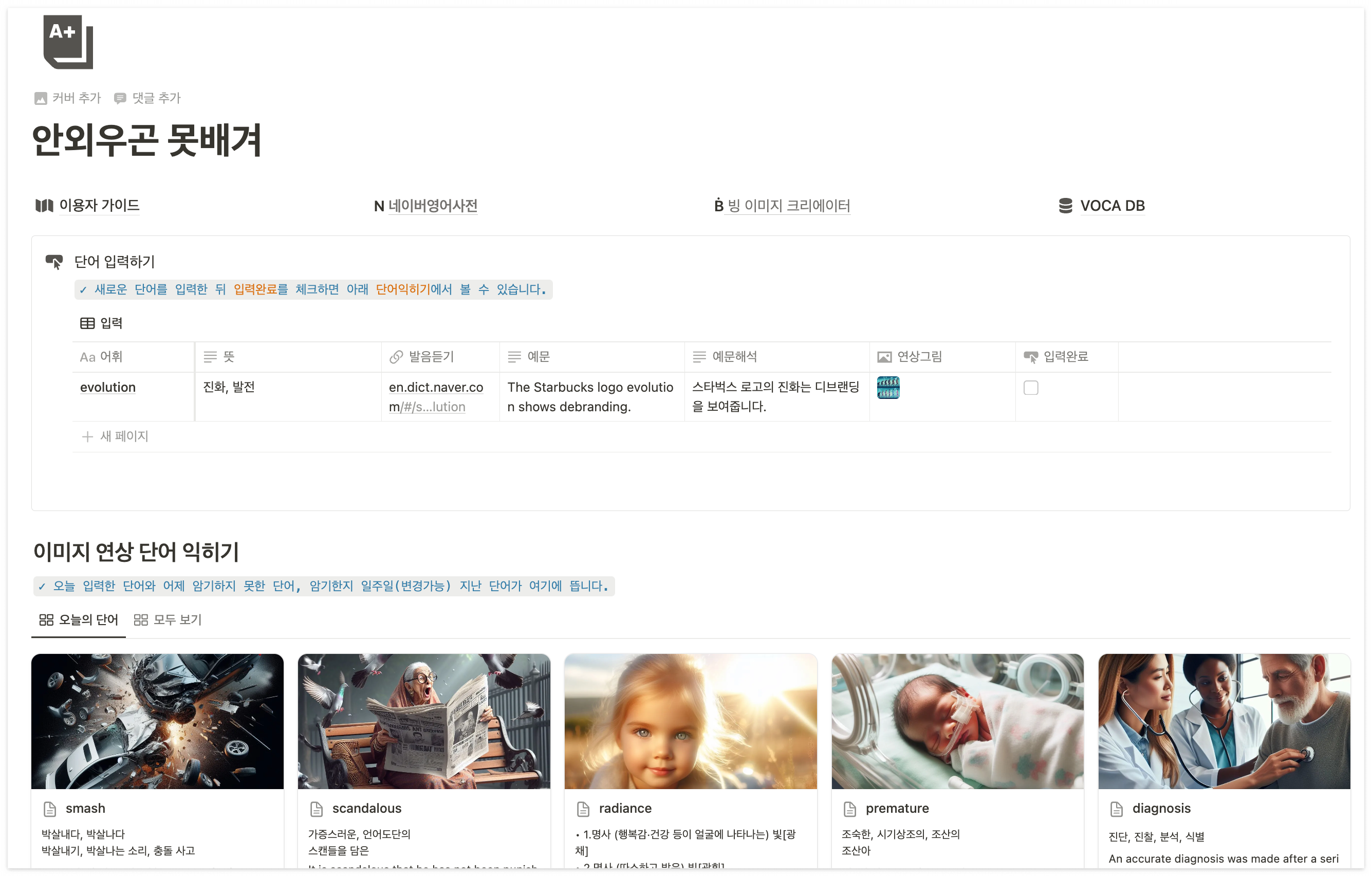 빙 이미지 크리에이터로 무료 이미지를 생성하고, 네이버 사전 바로가기를 통해 단어의 뜻과 예문을 빠르게 가져올 수 있도록 구성해서 단어 입력부터 빠르고 쉽게 이루어집니다. (글 하단 템플릿 받기 링크 있음)