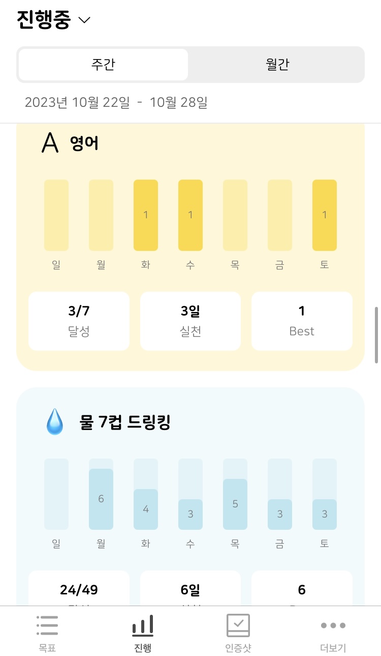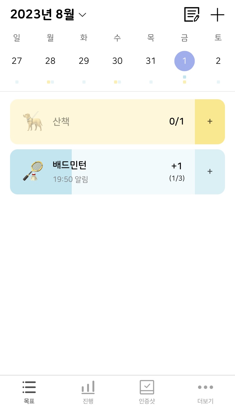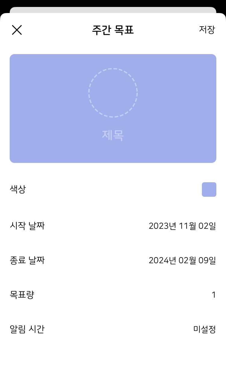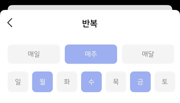 매주 해야 하는 습관이지만 요일이나 날짜가 정해지지 않고 회수만 목표로 설정하는 경우에는 '주간목표'로 들어가서 횟수 지정만 해주시면 되고, '월간목표' 또한 특정 날짜 반복이 아닌 월 몇 회 이런 식으로 목표를 정할 때 하시면 됩니다.