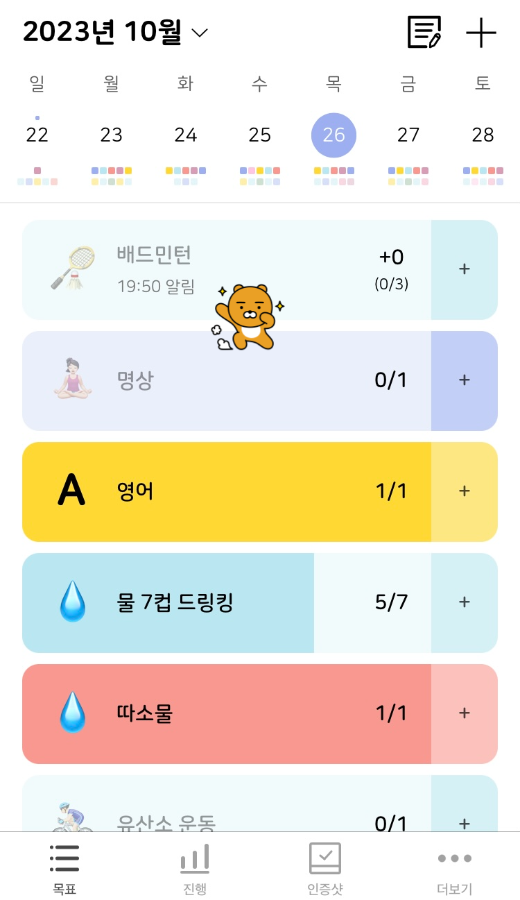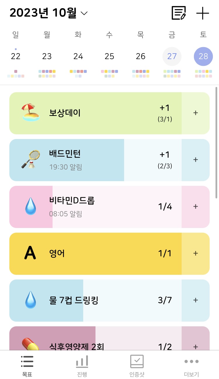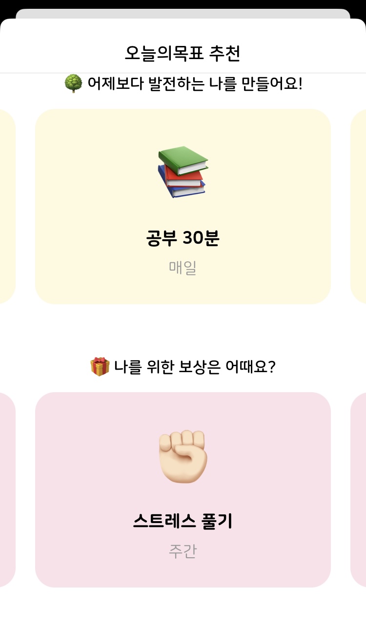 어떤 목표를 설정해야 할지 잘 모르시겠다면 목표추가(+)에서 ‘이런 목표는 어때요?’를 클릭하시면 아래처럼 여러 가지 습관과 루틴, 할 일을 추천도 해준답니다^^
