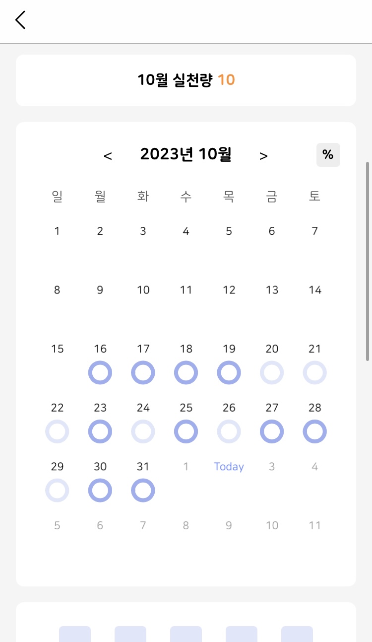 주간, 월간으로 목표 달성률을 보여주고 클릭해서 들어가면 달력에 달성한 날 표시가 되니까 내가 얼마나 열심히 했는지를 한눈에 볼 수가 있어요. 누적 달성률과 어떤 요일에 실천율이 높은 지도 알려줍니다.