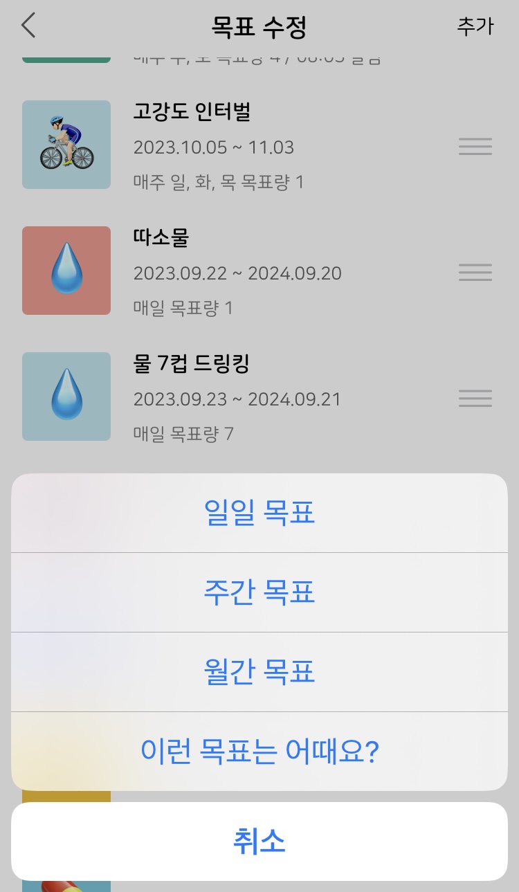오른쪽 위의 +버튼을 누르면 습관 및 루틴을 등록하고 이미 등록해 둔 목표를 수정할 수 있습니다. 오른쪽 위의 '추가'를 부르면 일일목표, 주간목표, 월간목표를 나누어 등록할 수 있게 되어있어요. 등록 전에 세 가지의 차이점을 알고 등록하셔야 합니다.
