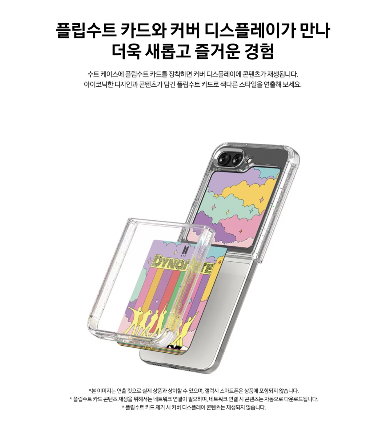 우선 플립수트 카드가 뭔지 모르시는 분들을 위해 플립수트 케이스 안내부터 해드릴게요. 플립수트 케이스는 갤럭시 z 플립5에 맞는 투명케이스입니다. 이 투명 케이스 뒷면에 nfc로 작동하는 플레이트(플립수트 카드)를 넣으면 외부 디스플레이(플렉스 윈도우)에 다이내믹한 콘텐츠를 자동으로 보여주는 아주 재미난 기능이 있습니다.