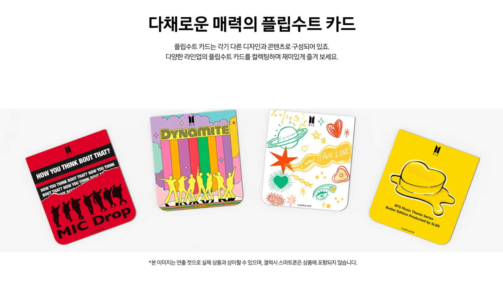플립수트 카드의 종류는 현재 80여 가지 이상 준비되어 있다고 하고, 앞으로 아이돌, 캐릭터, 브랜드 등과의 콜라보 플립수트 카드가 속속 출시될 예정이라고 합니다.