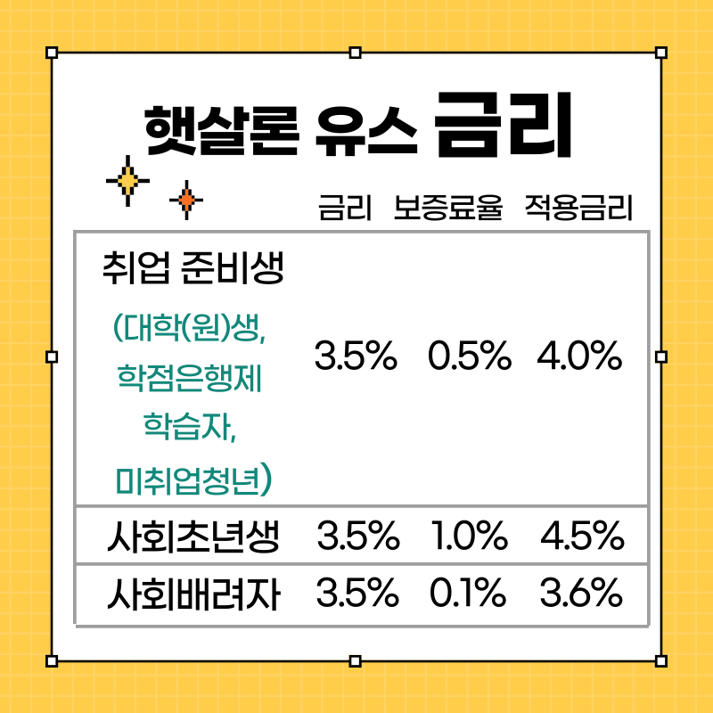 이럴 때 나라에서 보증해 주는 저금리 대출상품인 햇살론 유스가 있어서 얼마나 다행인지 모릅니다. 햇살론 유스는 만 19세 이상 34세 이하이면 거의 다 해당되실 거라 고민 없이 신청부터 해보시면 좋아요. 대학생, 대학원생, 취준생(미취업청년, 소위 백수^^;;), 학점은행제 수강자, 중소기업 1년 이하 재직 중인 청년이면 가능합니다.