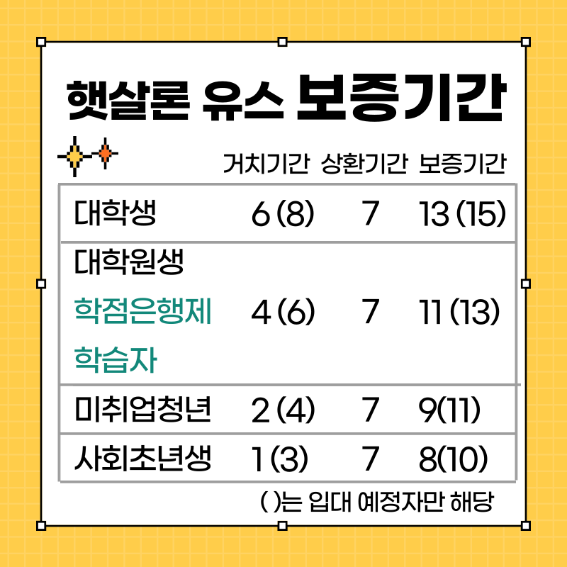 대학생은 최장 거치기간 6년, 상환기간 7년으로 보증기간이 13년이고, 대학원생과 학점은행제 학습자의 경우 최장거치기간 4년, 상환기간은 동일하게 7년이며, 미취업자는 최장 거치기간 2년, 상환기간 7년입니다. 사회 초년생은 거치기간이 1년, 상환기간은 7년입니다. 그리고 군입대 예정자의 경우는 거치기간을 2년 연장해 준다고 하니 안심하고 군입대 하셔도 되겠어요^^