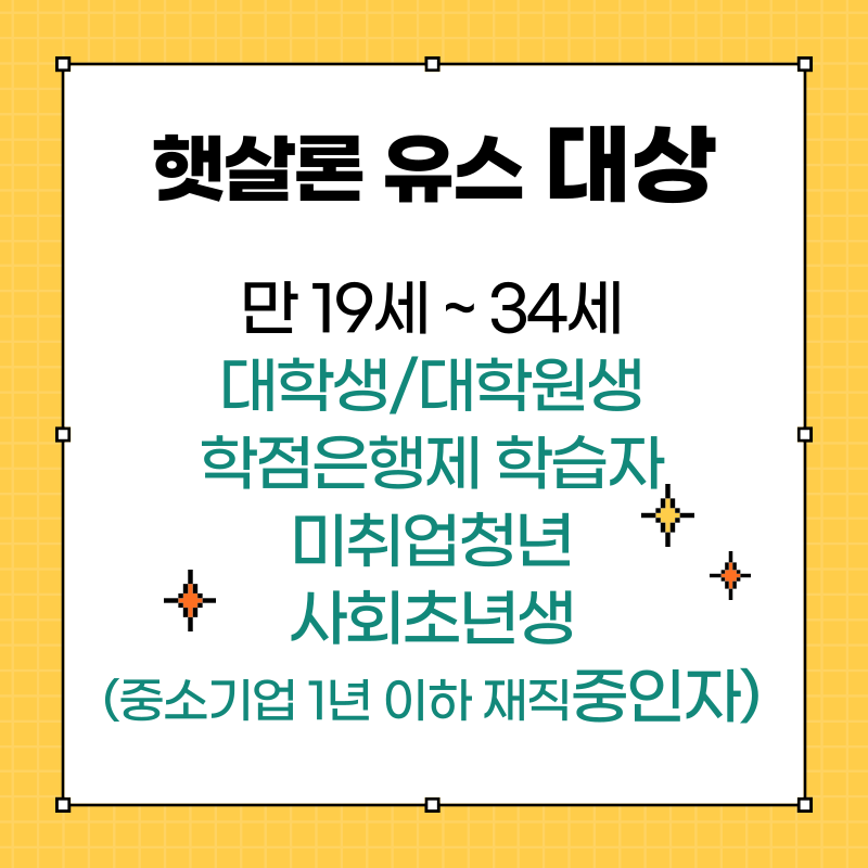 이럴 때 나라에서 보증해 주는 저금리 대출상품인 햇살론 유스가 있어서 얼마나 다행인지 모릅니다. 햇살론 유스는 만 19세 이상 34세 이하이면 거의 다 해당되실 거라 고민 없이 신청부터 해보시면 좋아요. 대학생, 대학원생, 취준생(미취업청년, 소위 백수^^;;), 학점은행제 수강자, 중소기업 1년 이하 재직 중인 청년이면 가능합니다.